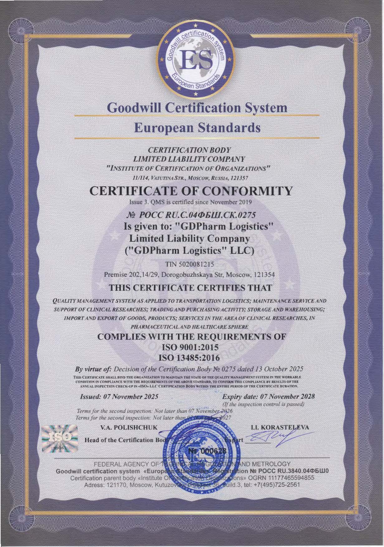 Our company is a reliable 3PL operator, which is confirmed by successfully passed audits of leading pharmaceutical companies. GDPharm Logistics provides services in accordance with GDP international quality standards, national Order 646n “On Approval of the Rules for Good Practice in the Storage and Transportation of Medicinal Products for Medical Use” and other regulations.